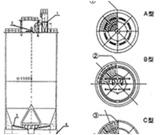 均化库系统是在库底中心位置设一锥形混合室,以降低库内的卸料压力,消除漏斗流。混合室设8-12个进料孔,在混合室和库壁之间的环形区设有8-12个充气区,卸料时轮流向相对的环形小区充气,使部分粉体物料流向中心混合室。在自上而下的流动过程中,切割水平料层而产生重力混合作用,进入混合室后又因混合室内的连续充气搅拌而进一步均化。这种库的均化值可达5-9。电耗0.15-0.30kwh/t。